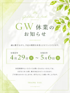 なおゴールデンウィーク期間中に頂戴したお問い合わせにつきましては、令和8年5月7日(木)より順次ご対応させていただきます。