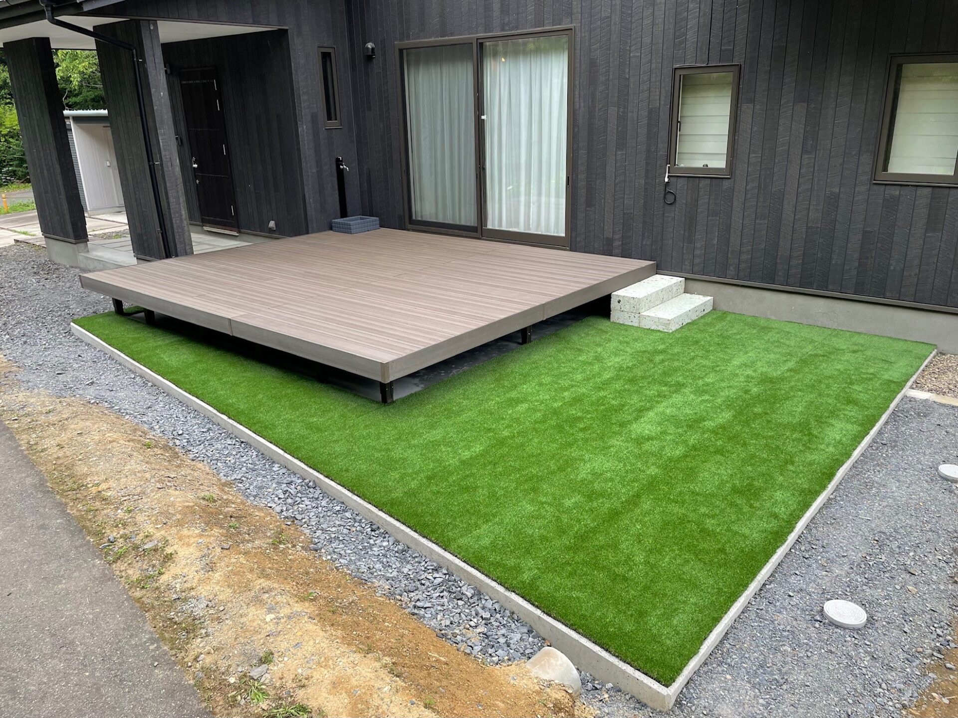 人工芝が綺麗に張れました。ウッドデッキからの階段は大谷石を使用しています。
