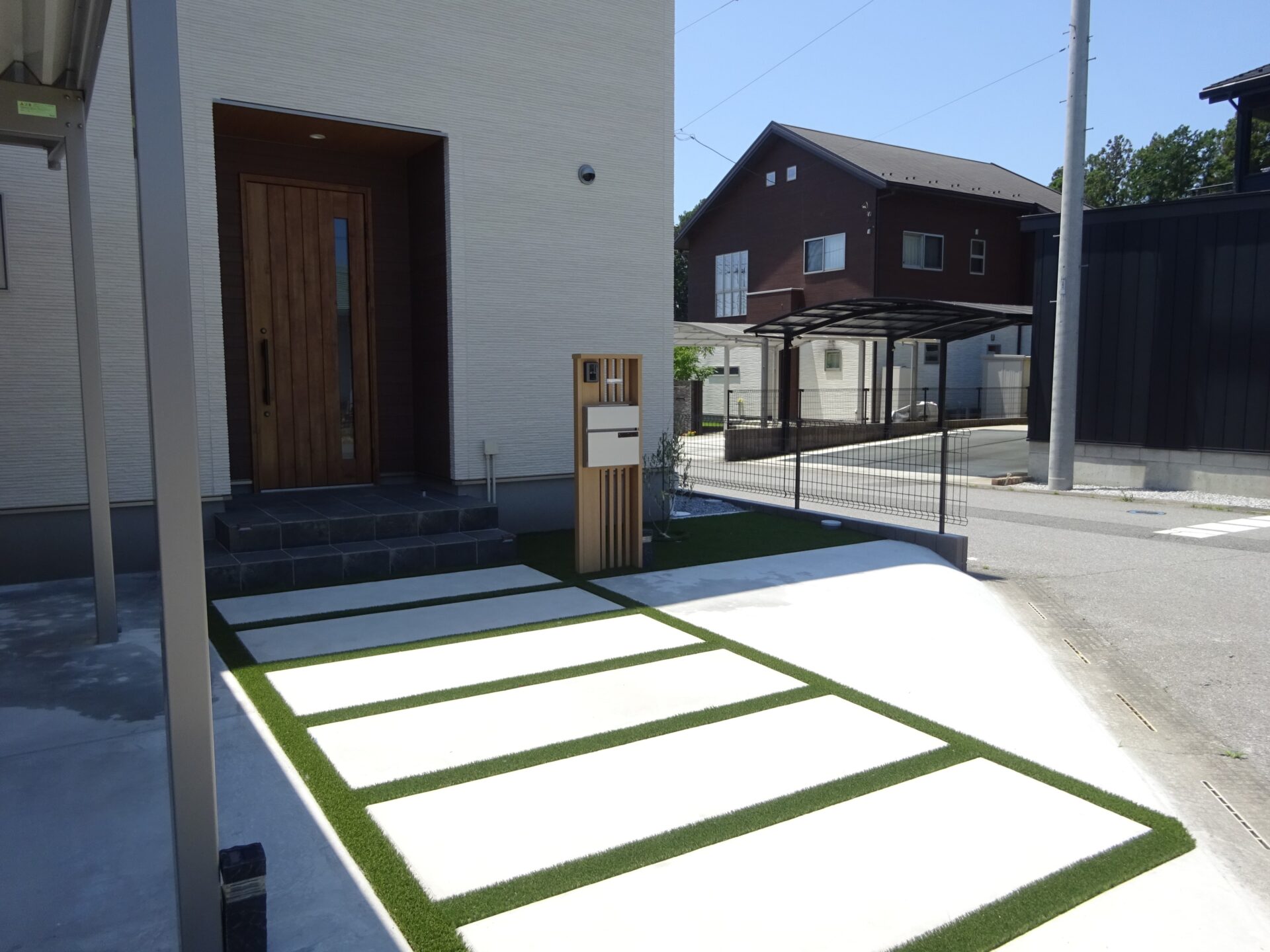 お施主様のアイディアで玄関アプローチにも人工芝を使用し、